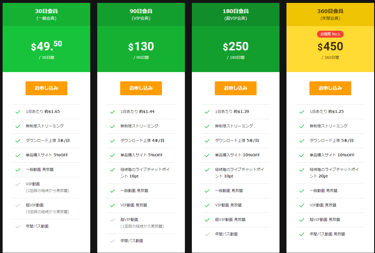 その会員がおすすめの人無駄な出費を控えるために1ヵ月単位でサービスを利用したい方VIP用動画を見たい方やより多くの動画をダウンロードしたい方