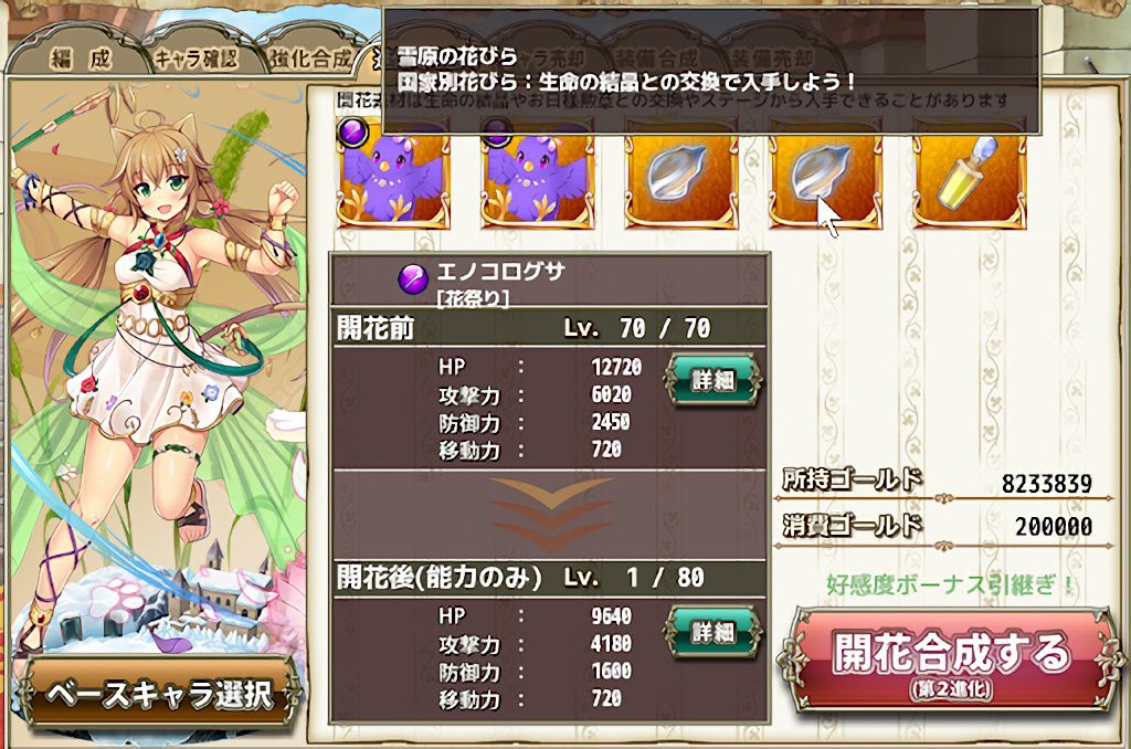 • ベースとなる花騎士に、他の花騎士を素材として合成させることで、ベースとなる花騎士を進化させることができる