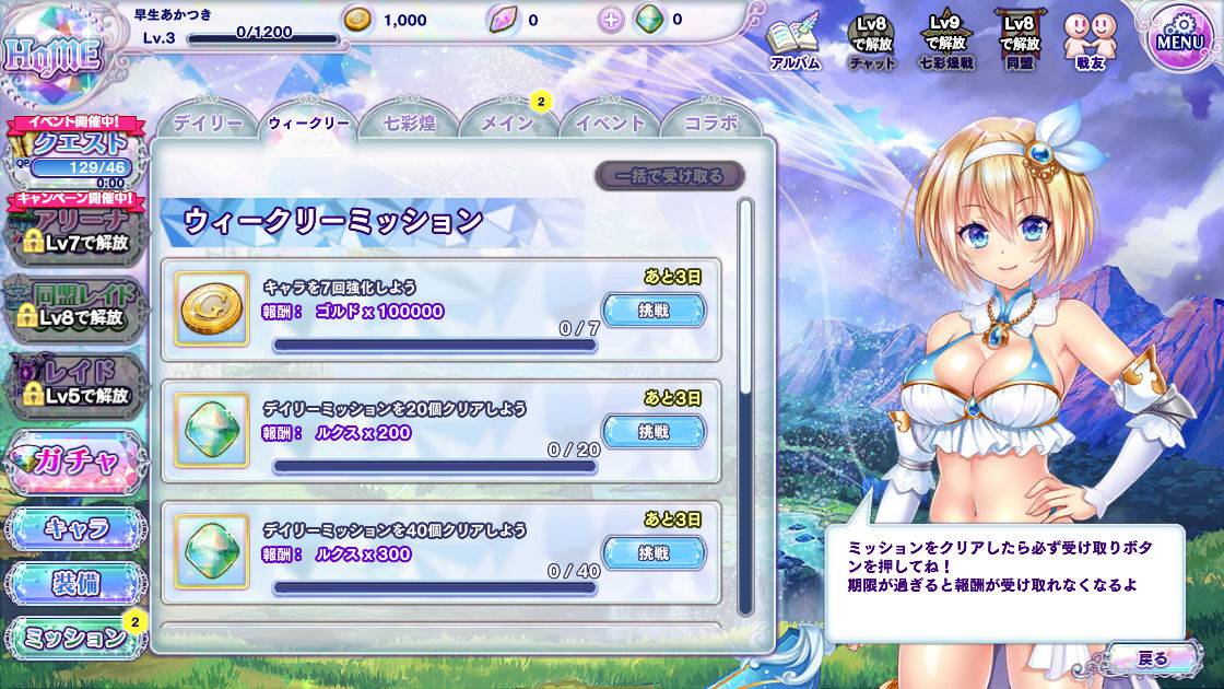 • ジェム(ガチャ用の石)を集めて、ジェムを使ってガチャを回して強いキャラクターを入手する